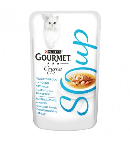 GOURMET СУП С ТУНЕЦОМ И КРЕВЕТКАМИ 40Gourmet Soup – это новое лакомство Gourmet, совершенно новый продукт: суп, который удивит кошек и их владельцев. Изысканный и нежный бульон с мелко нарезанным натуральным филе тунца или курицы. Жидкий компонент, представленный бульоном, помимо того, что делает Gourmet Soup особенно вкусным для кошки, обеспечивает часть рекомендуемой суточной нормы воды. Часть, которую можно жевать, состоит из натуральных кусочков курицы и тунца, целых креветок, вкусных анчоусов и вкусных овощей, которые видны в бульоне в зависимости от рецепта. Ингредиенты: Рыба и рыбные субпродукты (из них 20 % натурального филе тунца). ), моллюски и ракообразные (креветки 4%), субпродукты растительного происхождения
