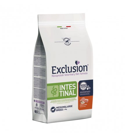 Exclusion Medium Large Breed Intestinal – это диетический корм с монопротеиновой рецептурой, изготовленный из единственного альтернативного источника животных белков, инновационных ингредиентов и консервированный натуральными токоферолами; представляет собой пищевую реакцию, доступную ветеринару, дифференцированную по размеру, в качестве пищевой поддержки для собак с желудочно-кишечными патологиями, нарушениями пищеварения и мальабсорбции.