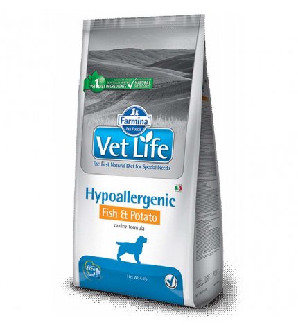 VETLIFE DOG ГИПОАЛЛЕРГЕННАЯ РЫБА И КАРТОФЕЛЬ Снижает побочные реакции на пищевые продукты. Farmina Vet Life Hypoallergenic Fish & Potato — полноценный диетический корм для собак, предназначенный для снижения пищевой непереносимости. Также рекомендуется в качестве вспомогательного средства для поддержки трофической функции кожи и ее придатков: глаз, ушей, анальных мешков.Механизм действия: Побочные реакции часто обусловлены остаточными веществами, присутствующими в пищевых продуктах (антибиотики, пестициды, добавки, красители, различные консерванты). к которому субъект становится чувствительным. Farmina Vet Life Hypoallergenic Fish & Potato содержит сельдь, дикую рыбу Северного моря, как единственный источник белка; и картофель как единственный источник крахмала. Кроме того, содержание белка усиливает гипоаллергенность продукта. Высокая концентрация незаменимых жирных кислот способствует уменьшению воспалительных процессов, поражающих кожу и придатки кожи.Состав: Картофель (69%), сушеная рыба (14%), рыбий жир, карбонат кальция, монодикальцийфосфат, хлорид натрия. Источники белка: рыба. Источники углеводов: картофель.Пищевые добавки: Витамин А 15000 МЕ; Витамин D3 900UI; витамин Е 150мг; витамин С 150 мг; ниацин 38 мг; пантотеновая кислота 15 мг; витамин В2 7,5 мг; витамин В6 6 мг; витамин В1 4,5 мг; витамин Н 0,4 мг; фолиевая кислота 0,45 мг; витамин В12 0,06мг; холин хлорид 2000мг; бета-каротин 1,5 мг; цинк-хелат гидроксилированного аналога метионина 970мг; марганцевый хелат гидроксилированного аналога метионина 400мг; хелат железа глицина гидрат 185 мг; медный хелат гидроксилированного аналога метионина 68мг; селенометионин 68 мг; безводный йодат кальция 2,4 мг; таурин 1000мг. Антиоксиданты: экстракты природного происхождения, богатые токоферолами 10 мг. Аналитические компоненты: Сырой белок 15,50%; масла и жиры сырые 13,00%; сырая клетчатка 1,70%; сырая зола 7,60%; кальций 0,70%; фосфор 0,50%; натрий 0,25%; калий 1,10%; магний 0,095%; Жирные кислоты Омега-6 0,40%; Жирные кислоты Омега-3 2,20%; ЭПК 0,60%; ДГК 0,83%.Энергетическая ценность: ЕМ Ккал/кг 3562 — МДж/кг 14,90.
