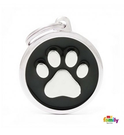 БОЛЬШОЙ ЧЕРНЫЙ КРУГ С ЛАПОЙ Смешной, модный, причудливый, любопытный. Для веселых и подвижных собак. Медали Charms, эмалированные вручную, изготовлены из микролитого металла и гипоаллергенного материала, производство Италия.