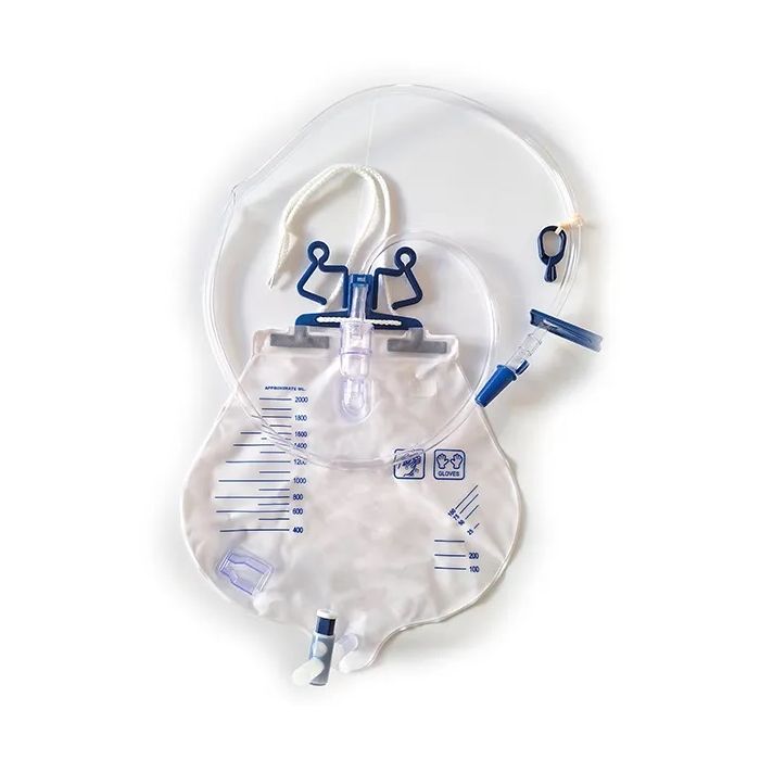 Мешок для сбора мочи замкнутого контура, вместимостью 2000 мл, с двойным воздушным фильтром, камерой для сбора капель, ремешком для крепления к кровати, зажимом для трубки и креплением трубки к простыне.
