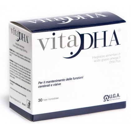 vita DHA — пищевая добавка омега-3 жирных кислот DHA Plus, показанная в питании детей, страдающих воспалительными заболеваниями различного типа и / или с нарушениями нервно-поведенческой сферы (СДВГ, гиперактивность, дислексия, дислексия развития). Он также показан при хронических воспалительных заболеваниях (муковисцидоз, системная красная волчанка, синдром Крона), пероксисомальных заболеваниях (синдром Зеллвегера, адренолейкодистрофия неонаталь инфантильная). Аллергены: содержит пищу (тонно) и сою.